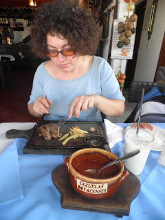 Dopo aver salutato i nostri compagni, rientriamo per una doccia calda e per rilassarsi un po’ sulla sedia a dondolo. Usciamo per la cena in una delle tante asaderias disposte in tutta Villa de Leyva e prendiamo un piatto unico completo con pinchos de carne varias e papas.