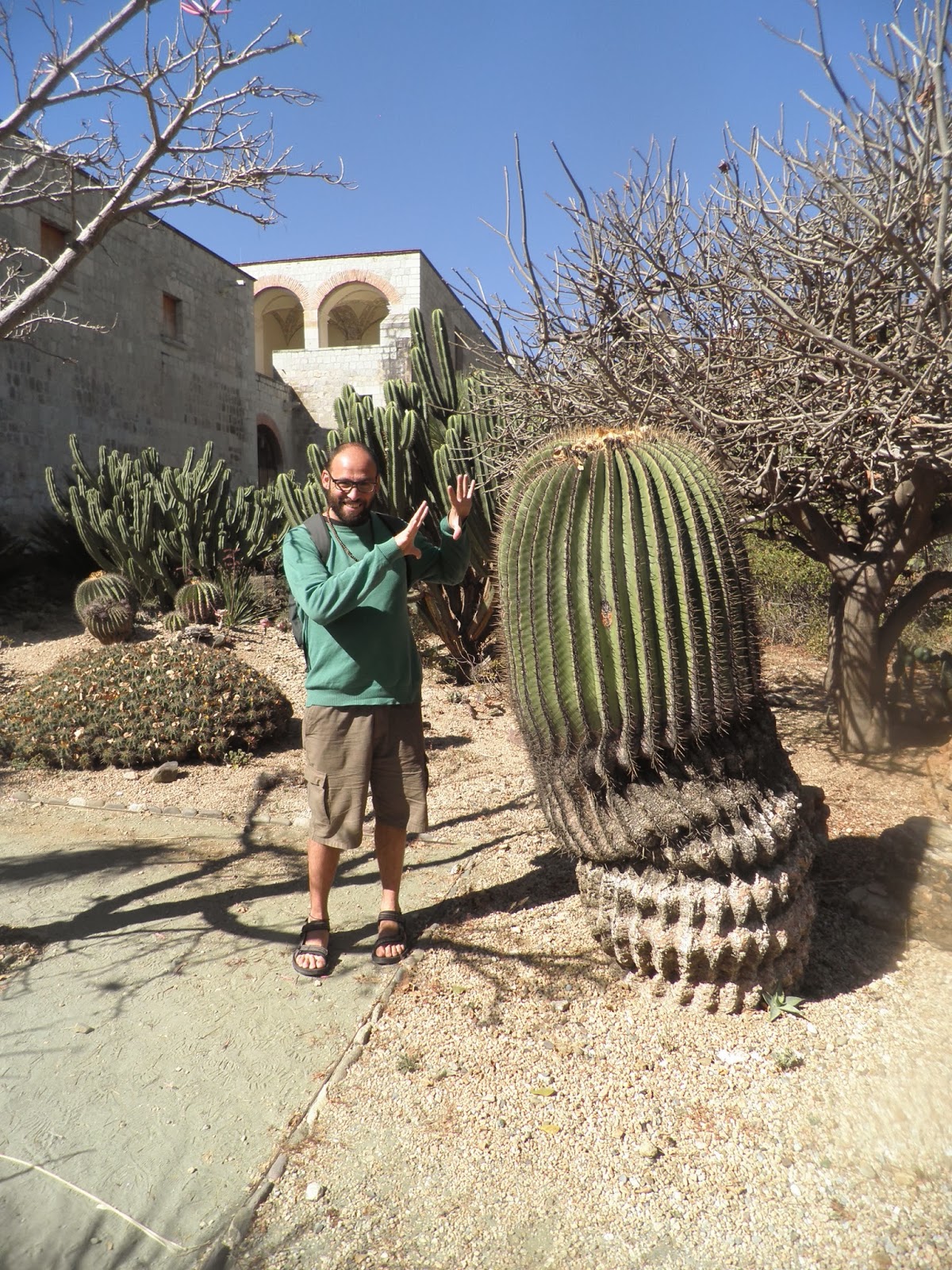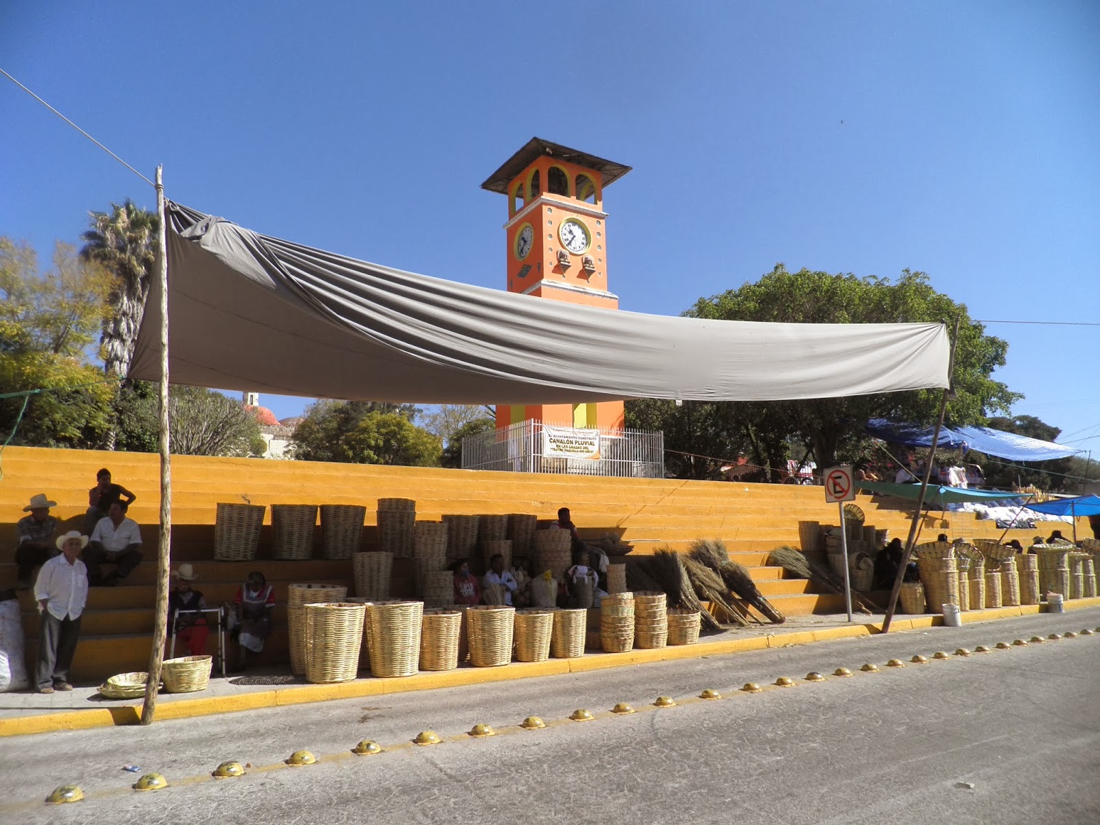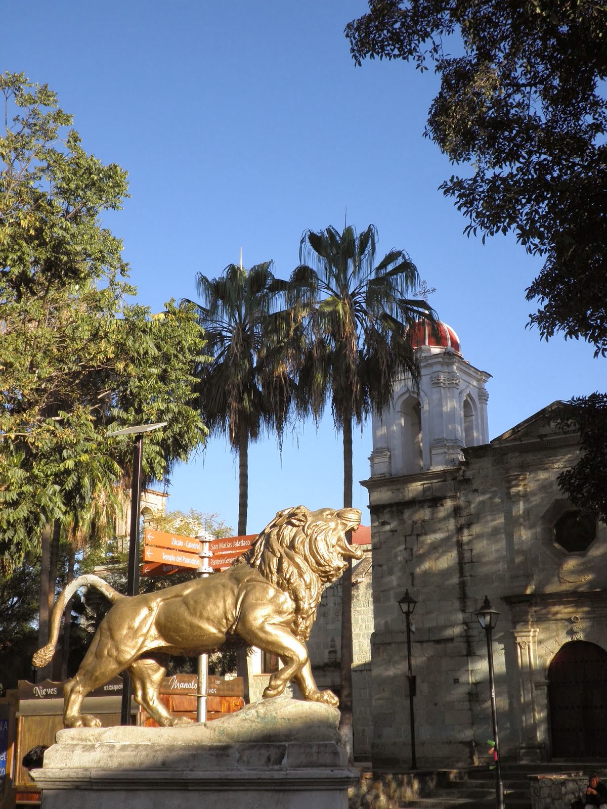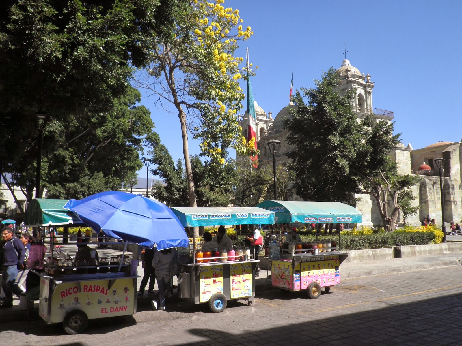 Nottata perfetta. recupero le ore di sonno perse nei giorni precedenti, dormendo dieci ore di seguito, e al risveglio mi sento decisamente meglio, anche se ci sarà da ristabilire un po’ di equilibrio nel mio intestino. Approfitto dell’uso gratuito di internet, per mandare notizie in Italia e rientro in camera per svegliare Elisa. Alle 8.00 facciamo colazione presso l’hostal, che è inclusa nel prezzo, e decidiamo di non allontanarci troppo e dedicare la giornata alla visita della città. Usciti dal Don Nino, attraversiamo il Paseo Juarez per raggiungere la farmacia e comprare l’ennesimo litro di Sali minerali. Proseguendo dritti, lungo calle Gomez Farias, raggiungiamo un acquedotto costruito con il classico stile ad ARCO CONTINUO. Alcuni locali notturni e dei coloratissimi bar occupano alcuni archi dell’acquedotto, mentre in lontananza l’Auditorio Guelaguetza svetta sul Cerro Del Fortin. Pian piano, scendiamo in direzione del Tempio De Santo Domingo, la più bella chiesa della città di Oaxaca. Costruita verso la fine del 1500, è stata fino a poco tempo fa parte di un monastero domenicano. Una piazza adornata di agave e cactus completano la meravigliosa cartolina di questo complesso. Entriamo a dare uno sguardo all’edificio il cui retro ospita un bellissimo giardino botanico. Aggiriamo il Tempio de Santo Domingo ed entriamo per una visita al giardino. Con l’aiuto di una guida, obbligatoria per tutti, compiamo un lungo tragitto attraverso centinaia di piante tipiche della regione dell’Oaxaca, e approfondiamo la nostra conoscenza botanica. Dai giardini rientriamo verso calle Alcalà e passeggiamo nella commerciale Andador Turistico. Dopo qualche minuto raggiungiamo l’Alameda de Leon, dove la cattedrale barocca di Oaxaca occupa il lato orientale. Pochi passi più a sud, il bellissimo Zocalo di Oaxaca. Fortunatamente, la zona è chiusa al traffico e gli alberi del parco allietano il calore estivo. Tutta la piazza è circondata da bellissimi portales (portici) che ospitano caratteristici caffè e ristoranti. La piazza è ideale per fermarsi un paio d’ore a sorseggiare una fredda birra o un caffè, osservando il viavai della gente. Come avviene spesso, anche oggi, all’estremità meridionale dello Zocalo, alcuni manifestanti protestano contro la scomparsa di alcuni militanti antigovernativi. Il pomeriggio sarà dedicato interamente alla visita dei mercati di Oaxaca: dopo quello di Benito Juarez, raggiungiamo quello conosciuto con il nome di 20 de Noviembre. Poi ci perdiamo nell’immenso e meno turistico Central de Abastos. Quest’ultimo, situato ad un km dal centro, è attivo tutti i giorni ed è ottimo per i prodotti dell’artigianato locale. Rientriamo nel tardo pomeriggio con qualche kg in più da riportare in Italia. Giusto il tempo di una doccia e poi usciamo per partecipare ad un evento musicale di marimbas. Conosciamo un paio di anziane signore che ci invitano a pranzare a casa loro l’indomani. Non che sia una brutta idea, ma le ringraziamo e le spieghiamo che domani saremo fuori città per visitare alcuni villaggi delle Valles Centrales. Cena con tacos al pastor e naturalmente NIENTE BIRRA!!!