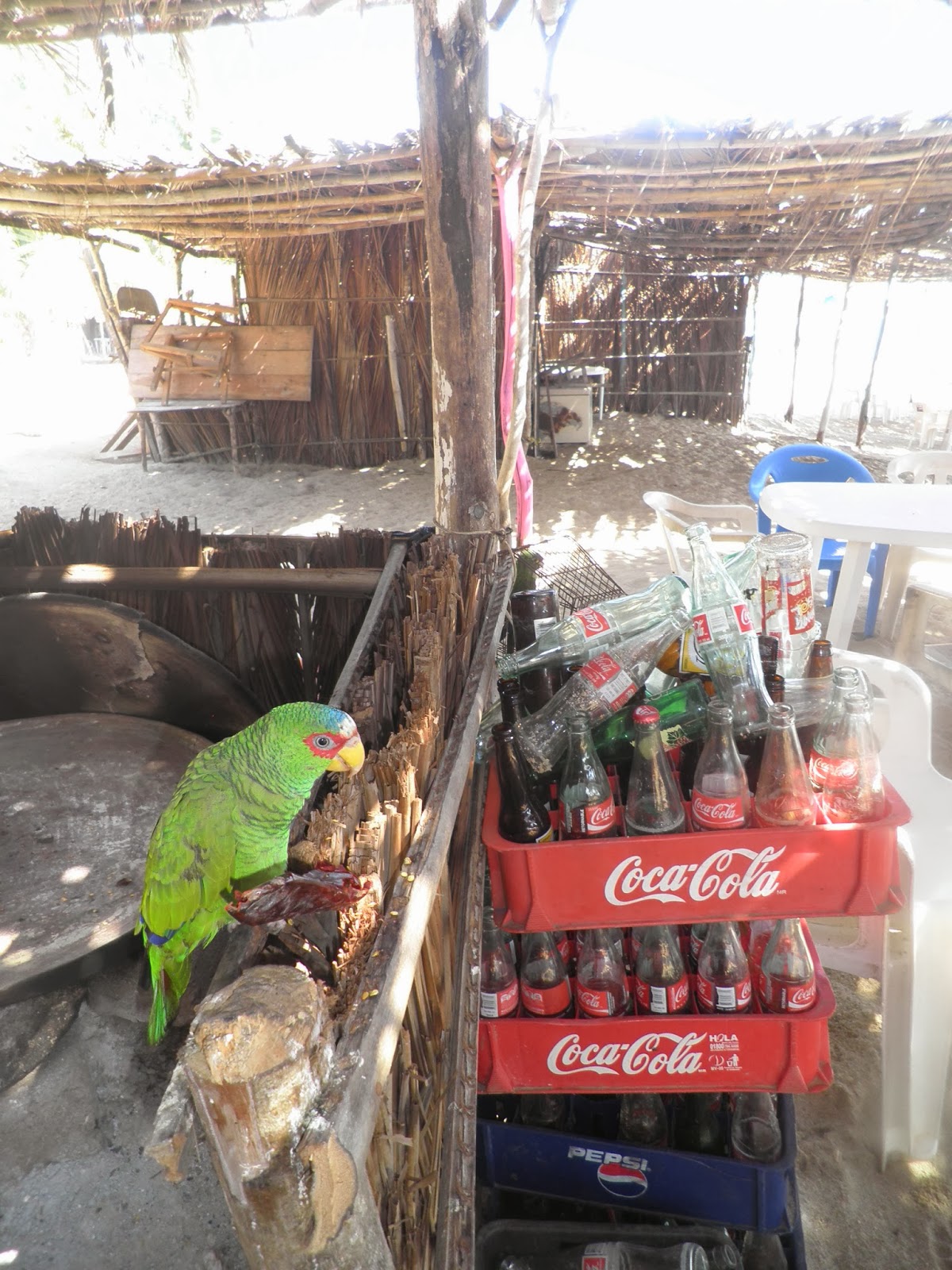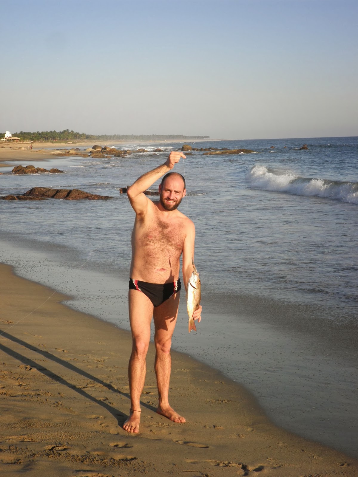 Il rumore delle onde del maestoso Pacifico ci ha cullato per tutta la notte, mentre le pale del ventilatore hanno alleviato leggermente il calore notturno. Per fortuna, di zanzare neppure l’ombra anche se le zanzariere come prevenzione erano pronte all’uso. Alle prime ore del mattino, mentre il sole sta sorgendo ad ovest, mi metto in cammino lungo la deserta spiaggia di Playa Ventura. Mi accompagnano nel mio camminare alcuni delfini che stanno giocando a pochi metri dalla riva, forse in cerca di una buona colazione. Poi, all’improvviso spariscono, così come erano giunti dal profondo dell’oceano, mentre io continuo la mia passeggiata. Non me ne rendo conto, ma rientro da Dona Celsa che sono passate due ore e mezza, giusto il tempo di una doccia, e poi giù tra i tavoli del ristorante per un’ottima colazione alla messicana: Huevos rancheros con caffé e latte. La giornata di oggi è degna di poche cose da segnalare, se non il lento ondeggiare delle amache appese alle palapas lungo il mare. A ritmo lento passa la mattinata, così com’è lento lo stile di vita dei Mestizos, popolazione di origini africane che si sono insediati nella costa Chica. Sembra infatti che i discendenti della popolazione di queste zone siano stati alcuni schiavi africani scappati dall’entroterra per cercare un rifugio sicuro. Altre voci invece, attribuiscono ad alcuni africani reduci di un naufragio, le origini di questo popolo che caratterizza la costa del Guerrero. Noi ci uniamo a loro con molta calma e ci godiamo il meritato riposo con vista sul Pacifico. Durante il pranzo, conosciamo una simpatica coppia proveniente dal DF, che una volta terminato il pranzo ci accompagna in auto ad una baia conosciuta con il nome di Casa de Piedras. Alcune rocce sul margine nord della baia caratterizzano questa spiaggia isolata, a pochi km da Playa Ventura. I nostri nuovi conoscenti si accamperanno in una delle palapas sulla spiaggia e si fermeranno qua per una settimana. Salutiamo i chilangos e raggiungiamo una delle amache situate lungo mare. Da queste parti le acque sono molto più sicure rispetto a Playa Ventura e ne approfittiamo per un paio di bagni rinfrescanti. A pomeriggio inoltrato, riconosciamo Luis, il proprietario del ristorante di oggi, e ci spiega che se ne andrà a pesca con la canoa a largo. In meno di un’ora rientra a riva con un bel Huachinango in mano e ci mettiamo d’accordo per mangiare il pesce la sera stessa. Luis e i suoi amici ci regalano un passaggio con il loro pick-up, fino a Playa Ventura e li ringraziamo dandoci appuntamento per le 20. Huacinango al Mojo de Ajo e dell’ottima tequila, in compagnia di Luis e il padre Bulmaro. Da queste parti la famiglia di Luis è conosciuta come LOS NEGROS PEREZ. Dopo cena scambiamo due chiacchiere con i fratelli e i cugini di Luis, che sono qua in visita dal Canada. La bottiglia di Tequila finirà senza accorgersene, e verso le 23 salutiamo la famiglia Perez, promettendo loro di rivederci il giorno seguente.
