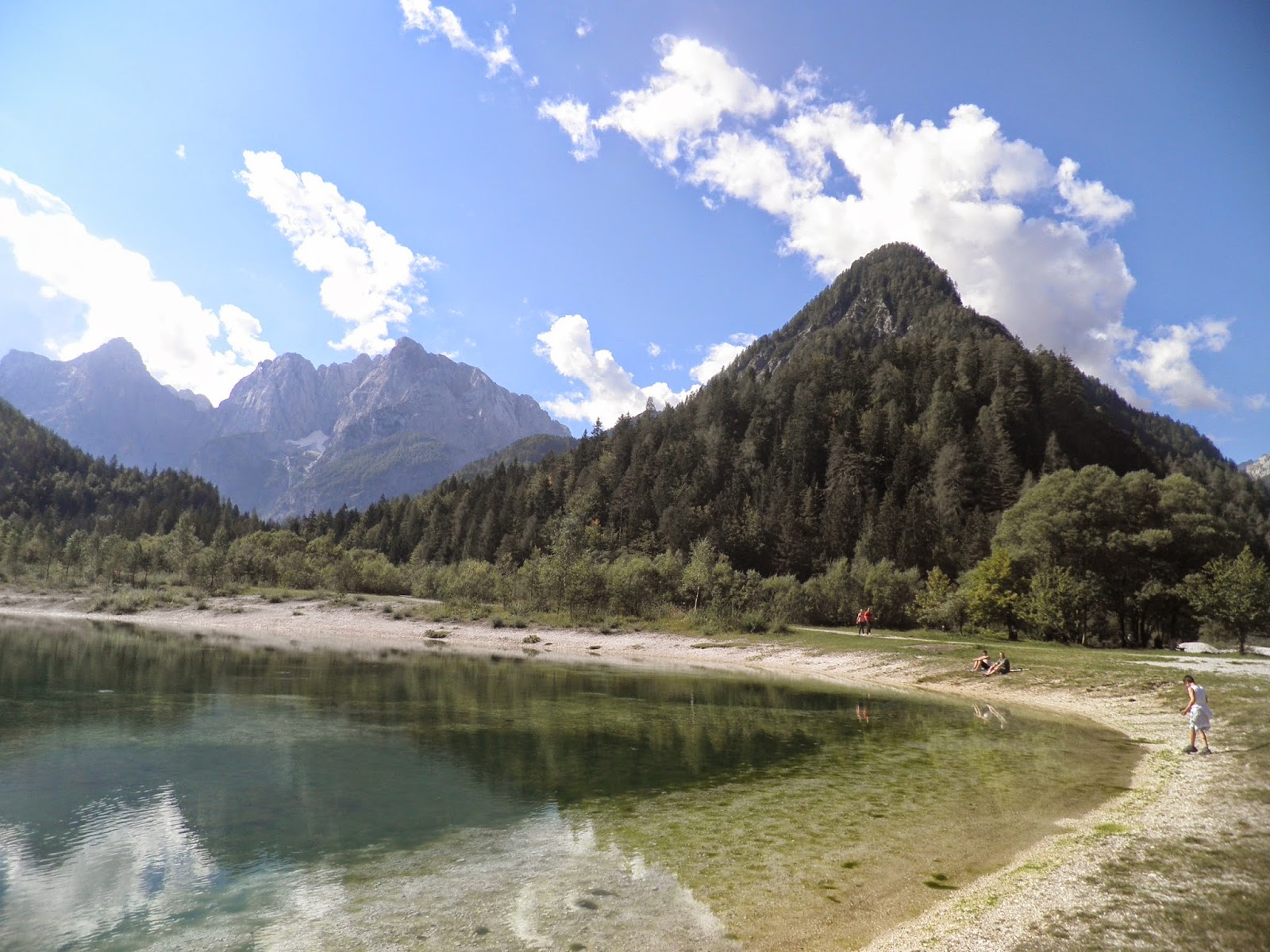 La giornata si presenta serena e calda, il sole sta facendo capolino tra le Alpi Giulie e noi ne approfittiamo per una colazione in terrazza sotto il tepore del sole mattutino. Paghiamo il nostro conto alla simpatica Natalja e ci incamminiamo verso nord-est. Appena usciti da Kobarid approfittiamo del prezzo economico del carburante per fare il pieno e in pochi minuti, lungo la valle del Soca, raggiungiamo prima Bovec e poi la deviazione per il Passo Vrsic. Da qui una strada tortuosa che regala vedute spettacolari, ci accompagna fino al Passo, situato ad un’altura di 1611m. La statale, che collega Kranjska Gora a Bovec misura circa 50 km ed è stato commissionato dalle autorità tedesche durante la prima guerra mondiale. E’ un susseguirsi di tornanti, ce ne sono almeno 60, tutti segnalati ed è ottimale per una giornata di sole in bicicletta. Il Passo rimane aperto da Maggio ad Ottobre ed è considerato uno dei capolavori dell’ingegneria stradale del XX sec. Una volta giunti al passo, ci soffermiamo in un rifugio per un caffè con vista mozzafiato e dopo una breve passeggiata, incominciamo la discesa. A pochi km da Kraniska Gora, ci fermiamo lungo le sponde del lago Alpino di Jasna e ne approfittiamo della bella giornata per una passeggiata e qualche foto. Decidiamo di fermarsi a Kraniska per un pranzo. Famosa località sciistica e di villeggiatura, Kraniska, è una piccola cittadina adagiata sulla valle della Sava Dolinka ed è un ottimo luogo per assaporare alcune prelibatezze della zona. Noi ci deliziamo con dell’ottima polenta accompagnata da ottima carne di cervo. Giusto il tempo di pranzare, passeggiare sull’unica via del centro con la piccola piazza adorna di piccole bancarelle e poi riprendiamo il nostro cammino verso la meta successiva. Alle 15.00 ci incontriamo con Spela, la slovena di Bled che ci consegna le chiavi del nostro appartamento. A pochi passi dal lago, l’Apartmaji Muznik è un’ottima sistemazione con un buon rapporto qualità prezzo e in situazione favorevole. Fuori dalla via principale, con un piccolo fiume che scorre sotto le finestre, ma a pochi minuti dallo spettacolare lago di Bled. Lasciamo i nostri bagagli nell’appartamento ed usciamo per una passeggiata. Approfittiamo dell’ultima ora di sole per una bellissima passeggiata lungo il perimetro del lago, giusto in tempo per rientrare e scampare ad uno dei temporali più forti che io abbia mai visto. Al termine della pioggia esco per comprare qualcosa al supermercato e le strade sono completamente allagate. Il parcheggio del supermercato è sott’acqua e rientro in casa con le scarpe completamente zuppe di acqua. Per fortuna l’acquazzone è solo passeggero e dopo cena esco per una passeggiata in centro con una spettacolare vista sul castello di Bled illuminato.